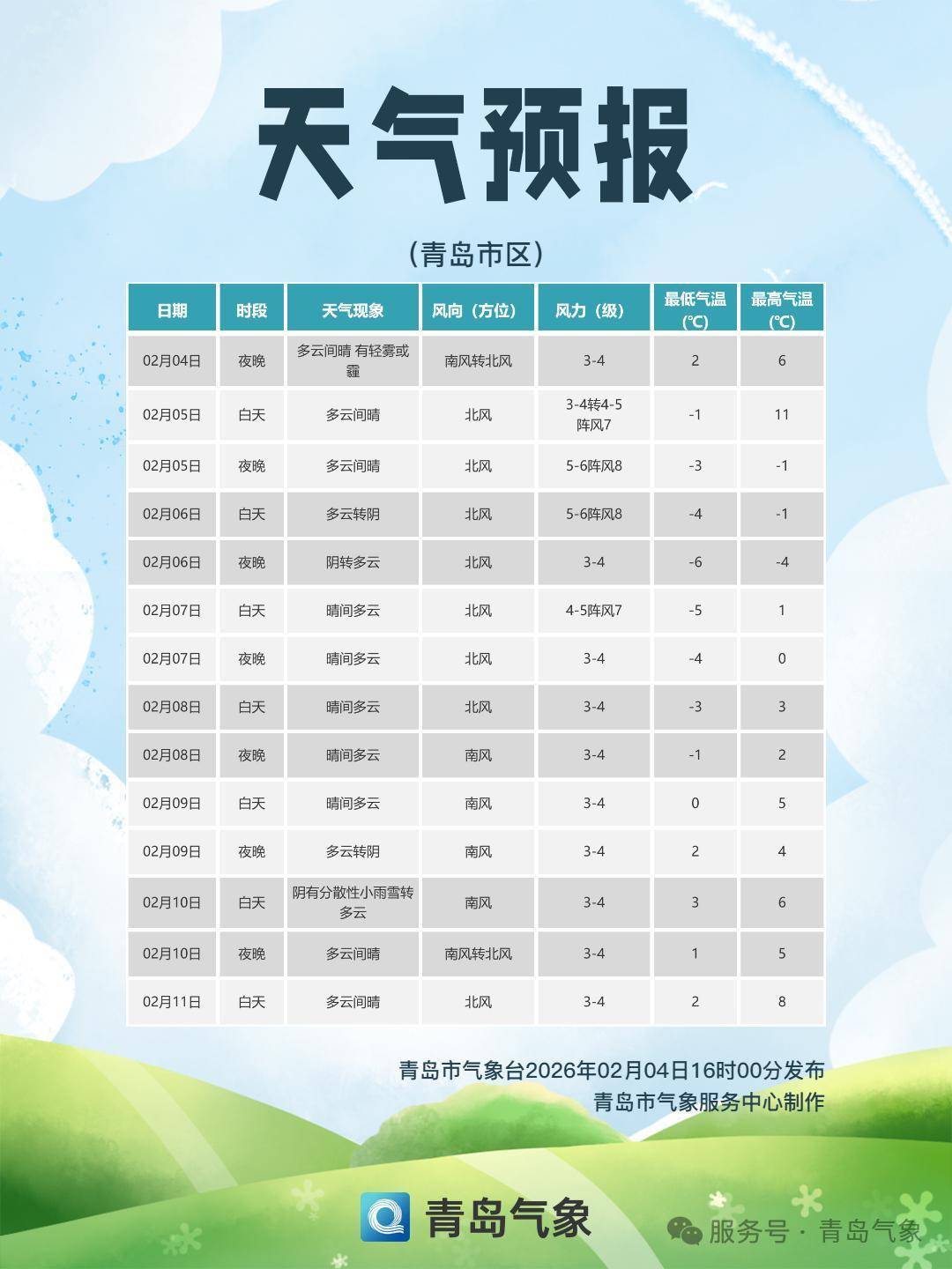 7日新一股冷空气补充影响青岛,这股冷空气没有5日至6日的那么强,但气温是在5~6日降温基础上继续下降,所以7日早晨将迎来本轮寒潮过程的气温最低点,沿海一带在-6℃~-9℃,内陆地区-11℃。