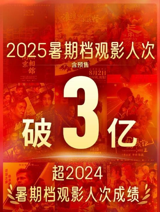 目前,2025年暑期档观影人次(含预售)已破3亿,超2024年暑期档观影人次成绩。